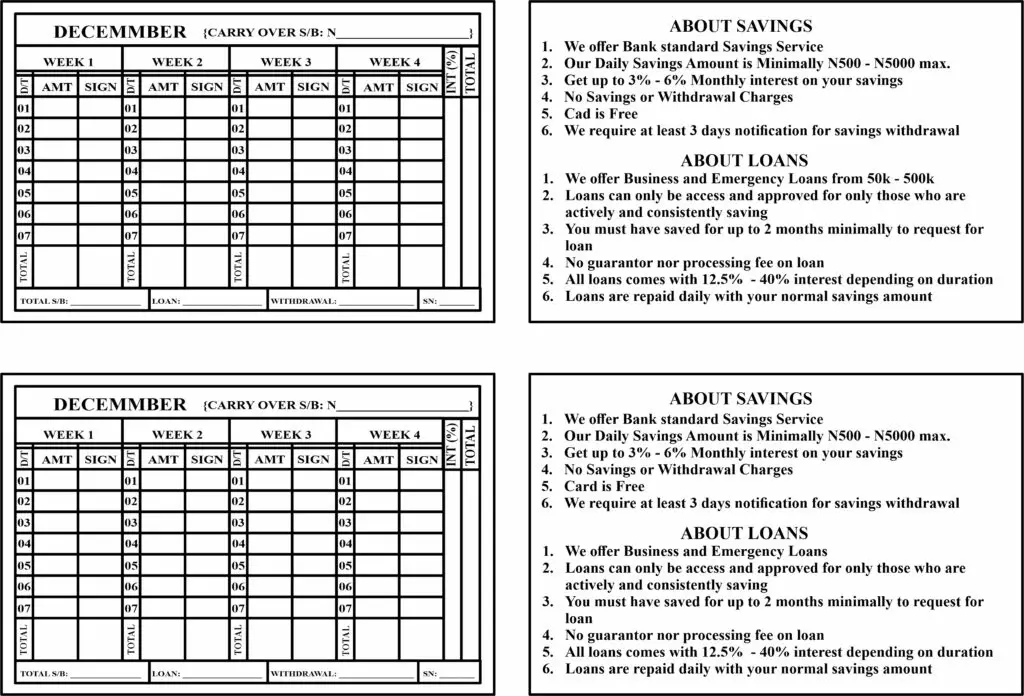 First, our loan repayment structure is stress free as customers repay loans through their normal savings. so if a customer is saving 500 daily, they only get to continue saving 500 daily until they finish paying off the loan plus interest. and in case a customer of an agent default in repayment and after all have been done to recover the loan, the loan capital + interest will be deducted from agent. earning installmentally until it is paid completely