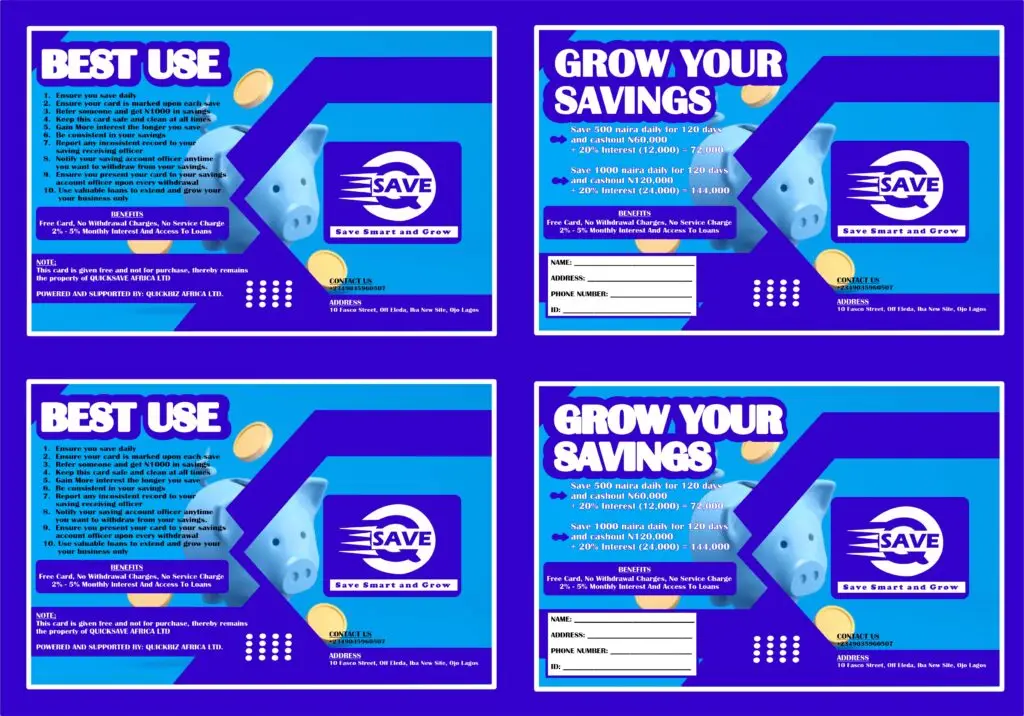 Quicksave Africa ltd is a subsidiary of Quickbiz Africa LTD with RC1867360 as a platform aim at creating innovative solutions for business and financial growth. Quicksave is birthed as a solution to help people save smart and grow their savings by combining the traditional ajo functionality with fintech innovation.